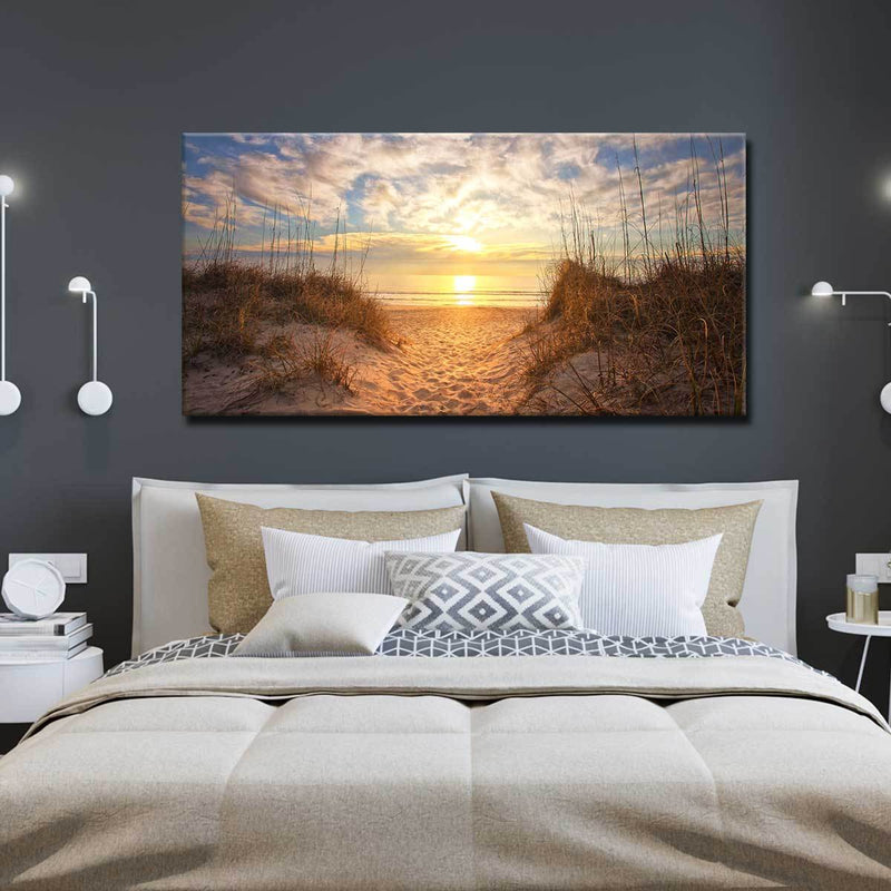 Indulge in the luxury of our expertly hand-stretched canvas, meticulously inspected by our dedicated team to ensure unparalleled quality. Each one of our canvases boast a sturdy wood frame. Experience the pinnacle of artistry and craftsmanship with our Sunrise at the beach Wall Art.